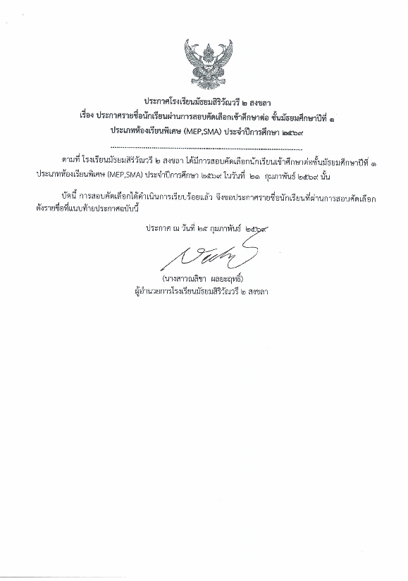 ประกาศ รายขื่อนักเรียนที่ผ่านการสอบคัดเลือก ม.1