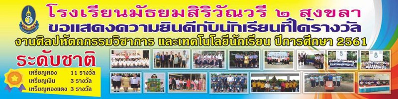 การแข่งขันงานมหกรรมความสามารถทางศิลปหัตถกรรม วิชาการ และเทคโนโลยีของนักเรียน ปีการศึกษา 2561 ระดับชาติ ในวันที่ 8-10 เดือนมกราคม 2562 ณ จังหวัดตรัง โดยโรงเรียนมัธยมสิริวัณวรี 2 สงขลา สามารถคว้ารางวัลติดมือกลับมาได้ทั้งสิ้น 11 เหรียญทอง 3 เหรียญเงิน และ 3 เหรียญทองแดง ดังต่อไปนี้