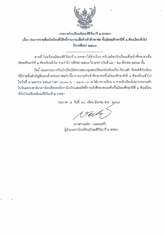 ประกาศ รายชื่อนักเรียนที่มีสิทธิ์รายงานตัว ม.1